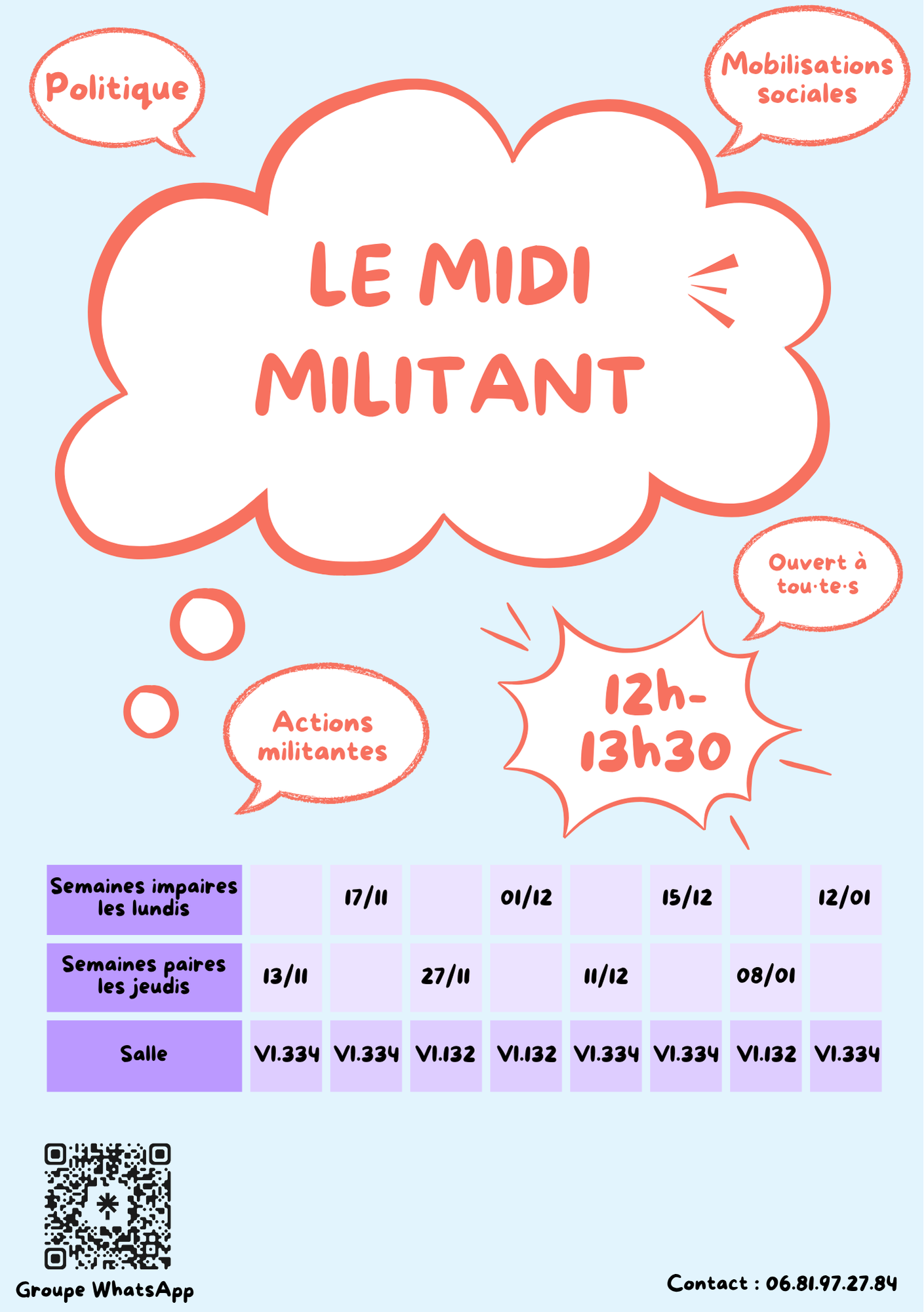 Le midi militant est un temps d’échange, ouvert à tou·te·s ; c’est l’occasion de partager ton point de vue sur l’actualité, discuter de militantisme sur le plateau, te tenir informé·e des actions en cours et pourquoi pas en imaginer de nouvelles ensemble !